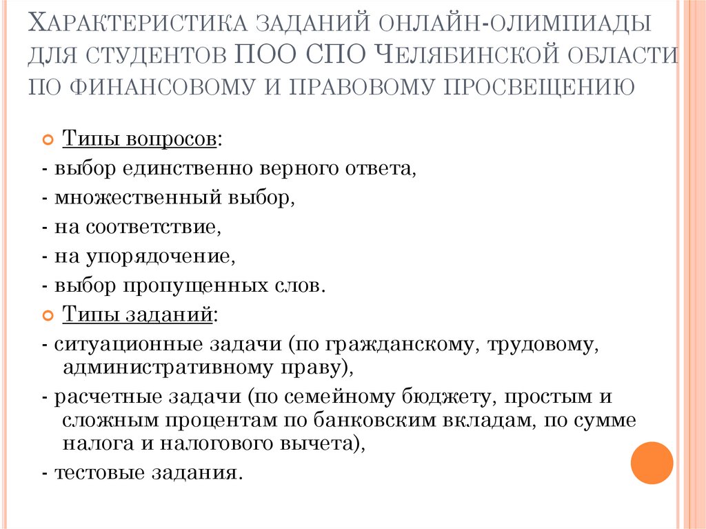 ХАРАКТЕРИСТИКА ЗАДАНИЙ ОНЛАЙН-ОЛИМПИАДЫДЛЯ СТУДЕНТОВ ПОО СПО ЧЕЛЯБИНСКОЙ ОБЛАСТИ