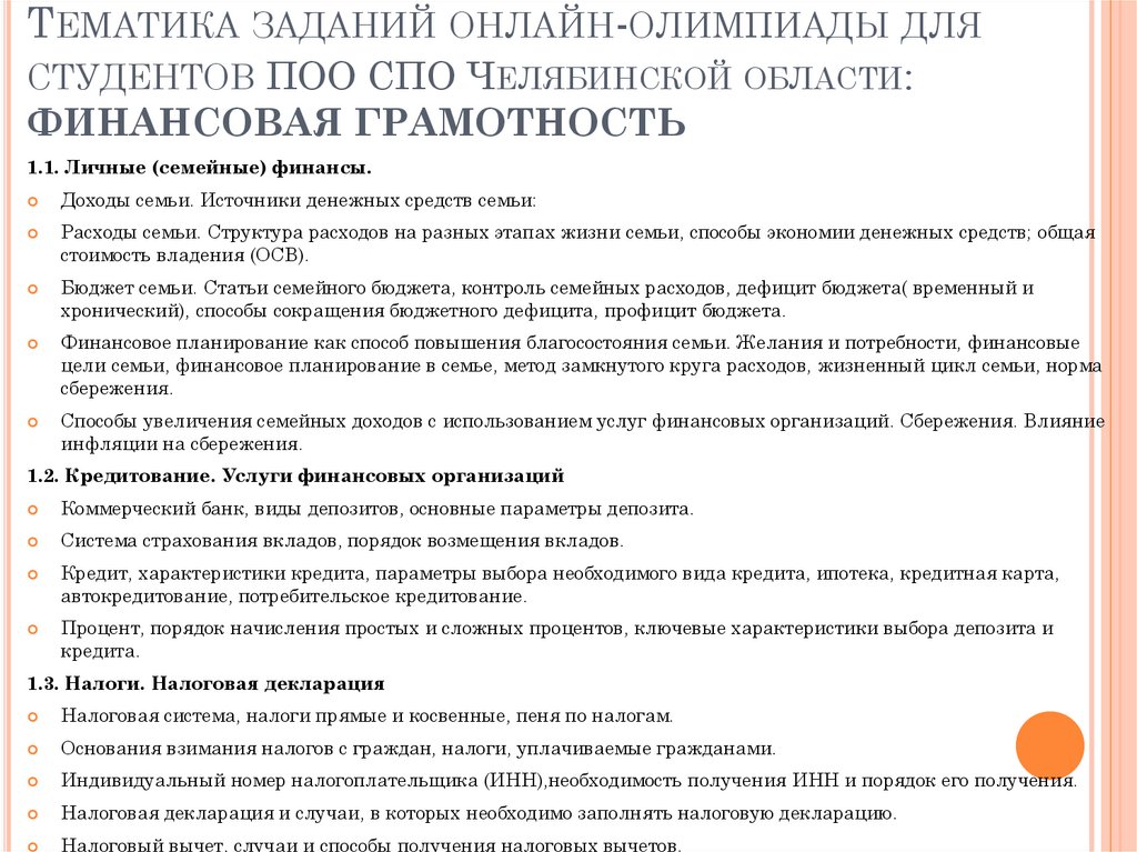 ТЕМАТИКА ЗАДАНИЙ ОНЛАЙН-ОЛИМПИАДЫ ДЛЯСТУДЕНТОВ ПОО СПО ЧЕЛЯБИНСКОЙ ОБЛАСТИ: