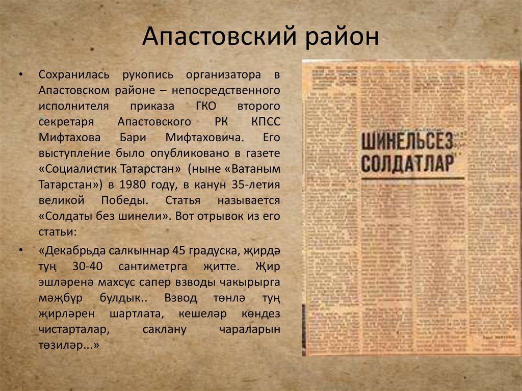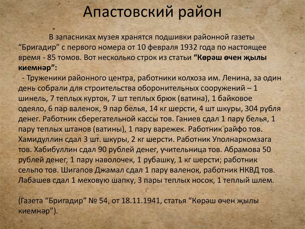 (Газета “Бригадир” № 54, от 18.11.1941, статья “Көрәш өчен җылы