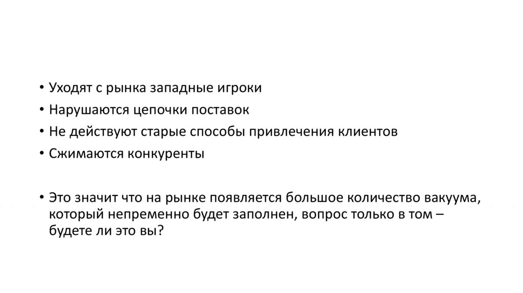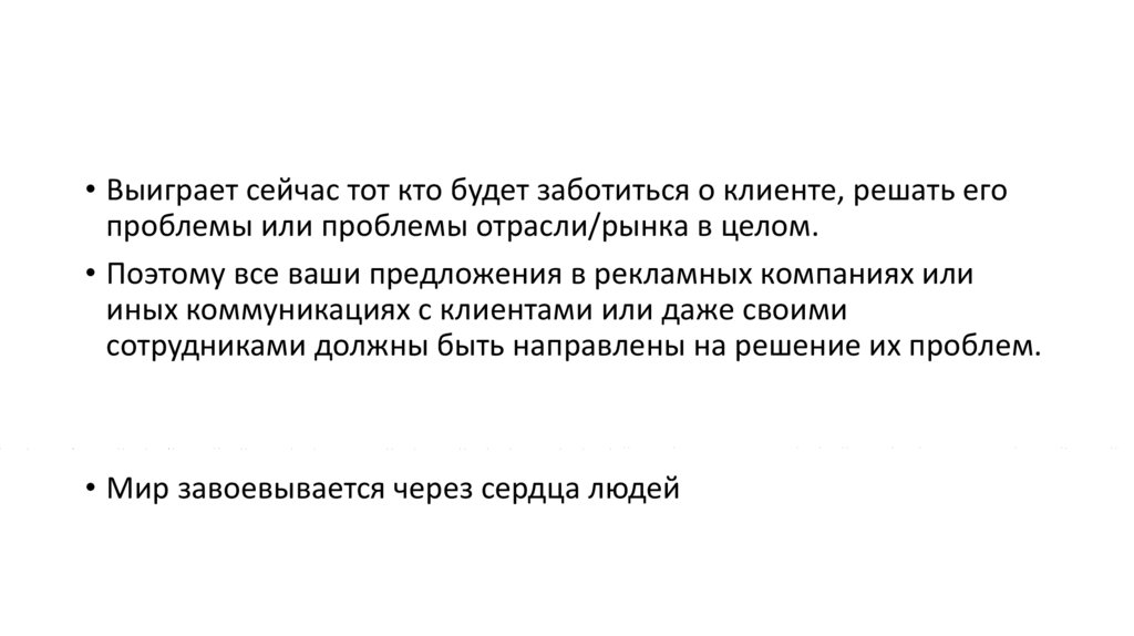 • Выиграет сейчас тот кто будет заботиться о клиенте, решать егопроблемы или проблемы отрасли/рынка в целом.