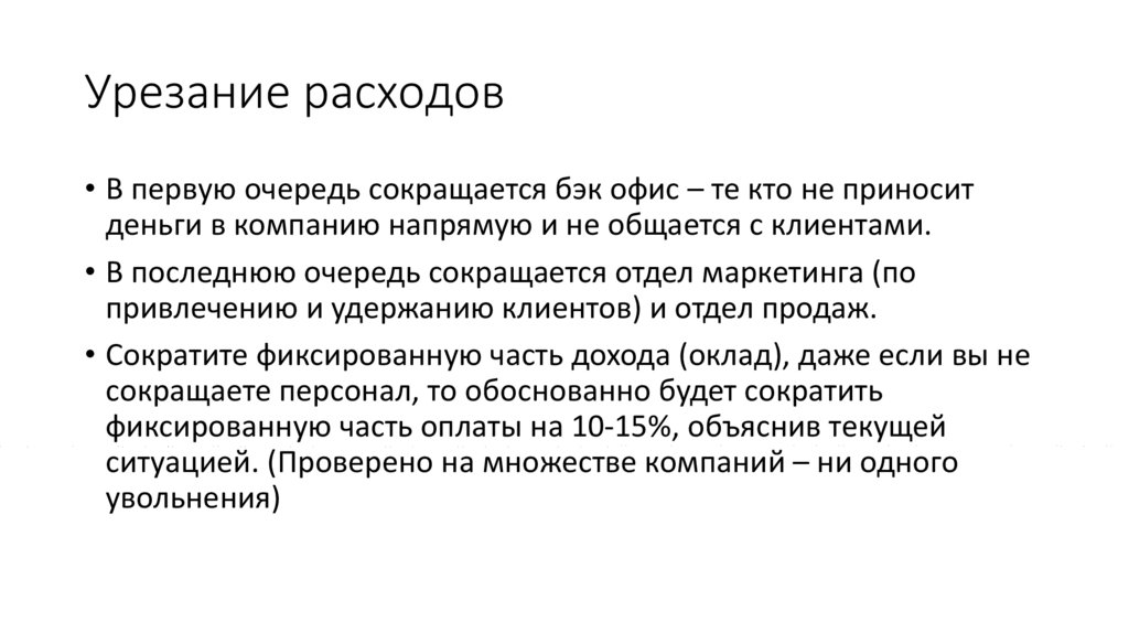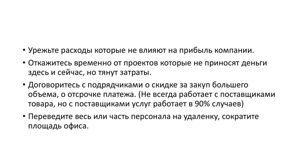 • Урежьте расходы которые не влияют на прибыль компании.• Откажитесь временно от проектов которые не приносят деньги