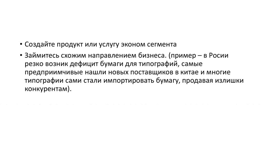 • Создайте продукт или услугу эконом сегмента• Займитесь схожим направлением бизнеса. (пример – в Росии