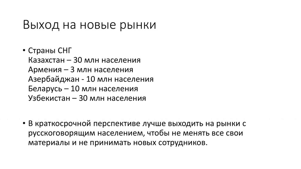Выход на новые рынки• Страны СНГ
