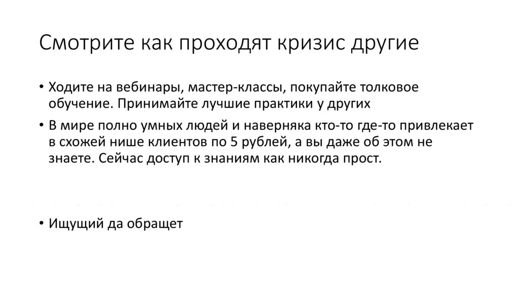 Смотрите как проходят кризис другие• Ходите на вебинары, мастер-классы, покупайте толковое