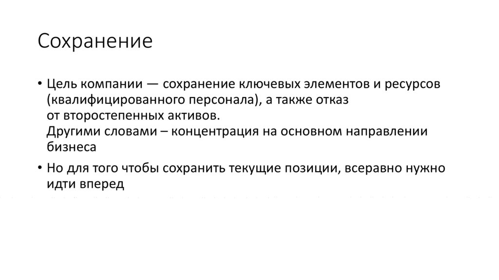 Сохранение• Цель компании — сохранение ключевых элементов и ресурсов