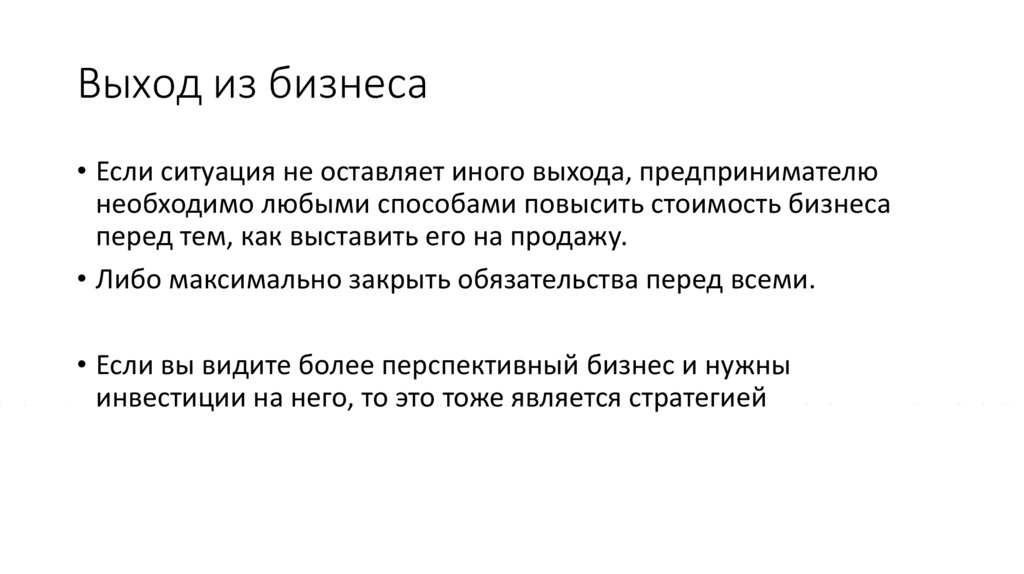 Выход из бизнеса• Если ситуация не оставляет иного выхода, предпринимателю