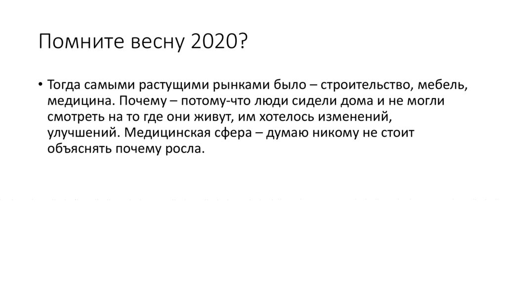 Помните весну 2020?• Тогда самыми растущими рынками было – строительство, мебель,