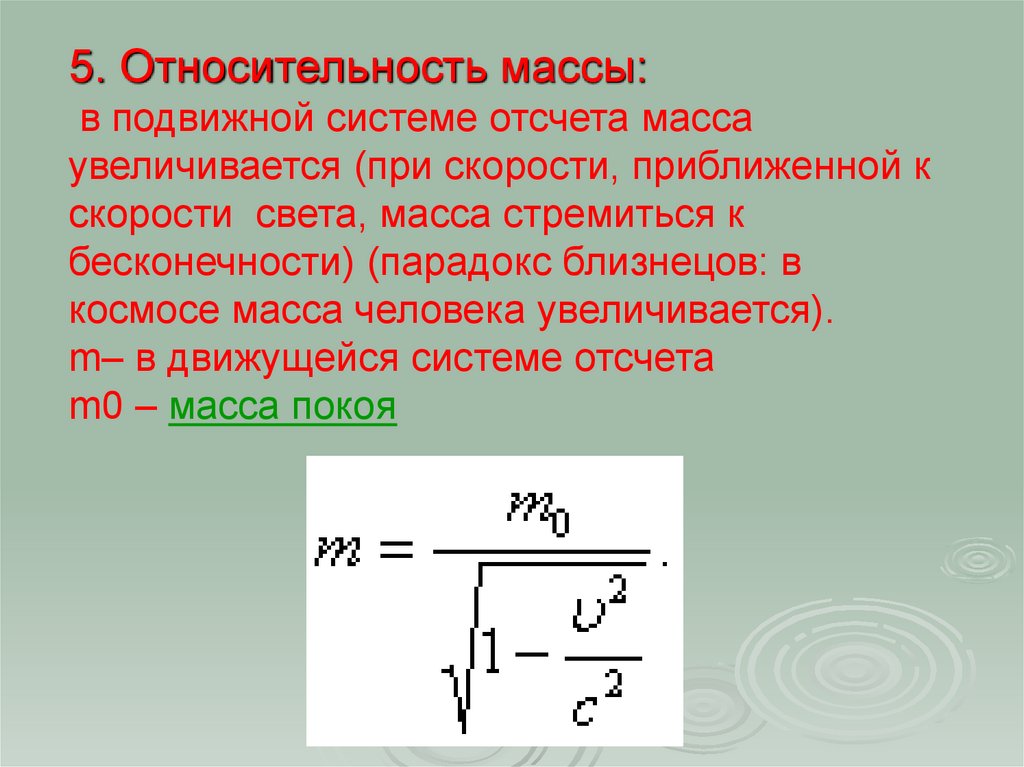 10. 3.Относительность длинны: в движущейся системе отсчета длина сокращается (парадокс близнецов: в космосе длина уменьшается).