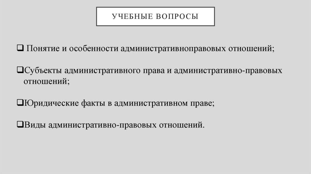 УЧЕБНЫЕ ВОПРОСЫПонятие и особенности административноправовых отношений;