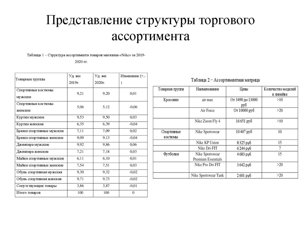 Таблица 1 – Структура ассортимента товаров магазина «Nike» за 20192020 гг.