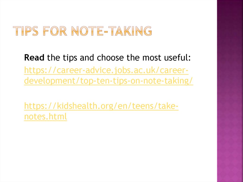 Read the tips and choose the most useful:https://career-advice.jobs.ac.uk/careerdevelopment/top-ten-tips-on-note-taking/