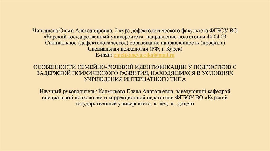 Чичканева Ольга Александровна, 2 курс дефектологического факультета ФГБОУ ВО«Курский государственный университет», направление подготовки 44.04.03