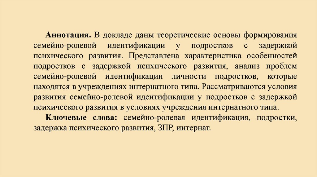 Аннотация. В докладе даны теоретические основы формированиясемейно-ролевой идентификации у подростков с задержкой