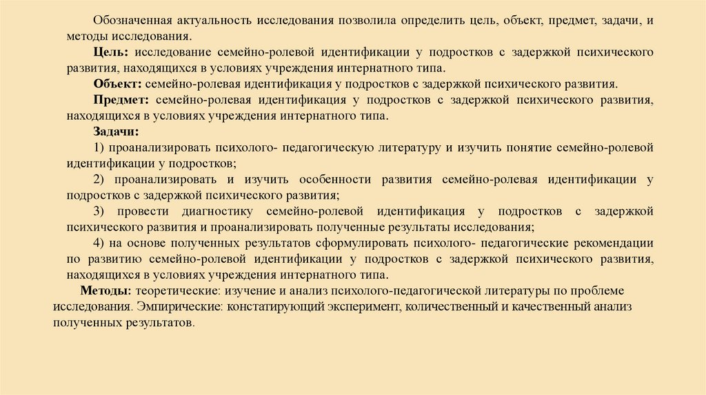 Объект: семейно-ролевая идентификация у подростков с задержкой психического развития.
