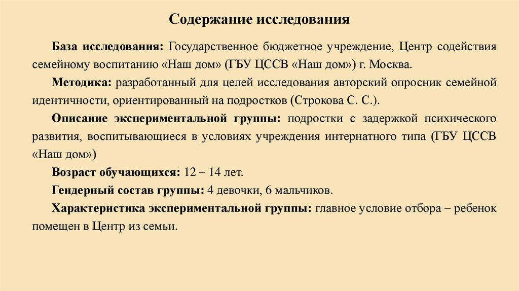 Содержание исследованияБаза исследования: Государственное бюджетное учреждение, Центр содействия