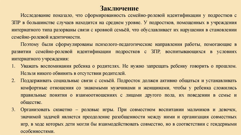 ЗаключениеИсследование показало, что сформированность семейно-ролевой идентификации у подростков с