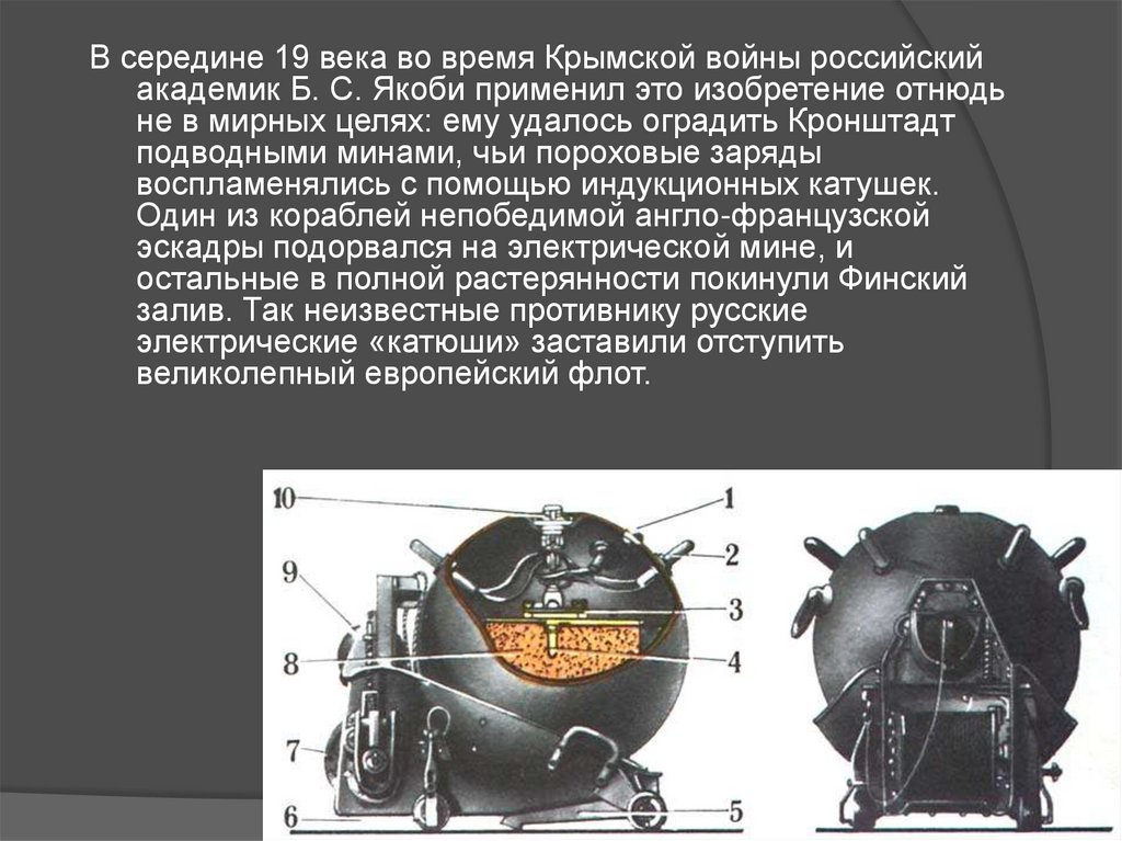 В середине 19 века во время Крымской войны российскийакадемик Б. С. Якоби применил это изобретение отнюдь