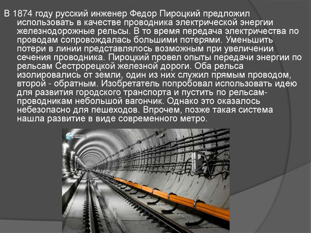 В 1874 году русский инженер Федор Пироцкий предложилиспользовать в качестве проводника электрической энергии