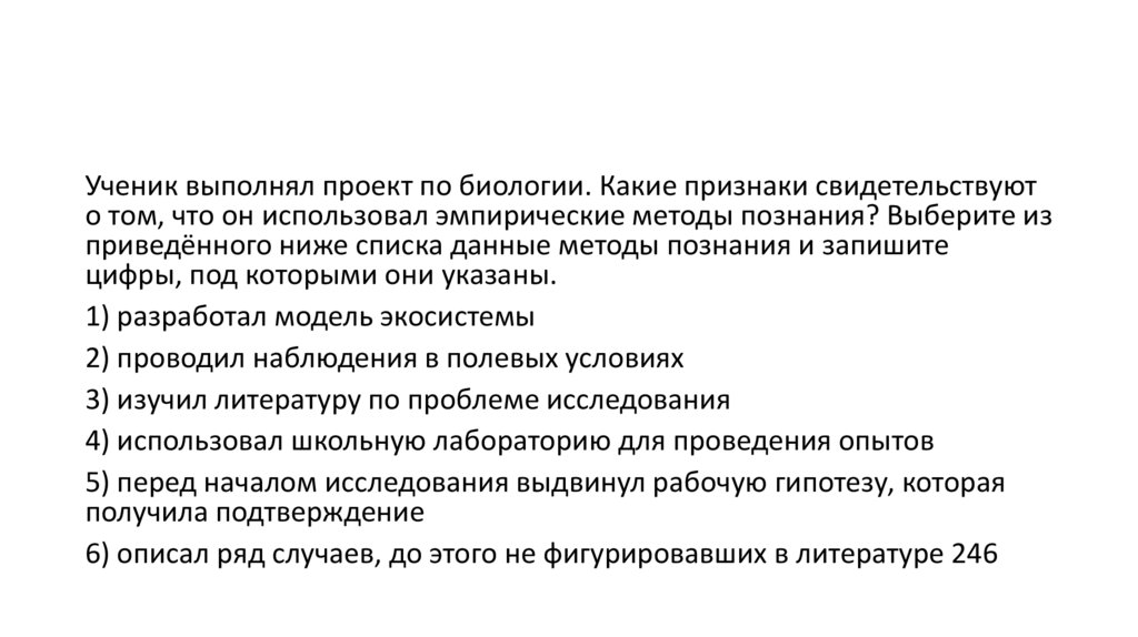 Ученик выполнял проект по биологии. Какие признаки свидетельствуюто том, что он использовал эмпирические методы познания? Выберите из