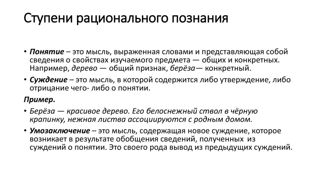 Ступени рационального познания• Понятие – это мысль, выраженная словами и представляющая собой