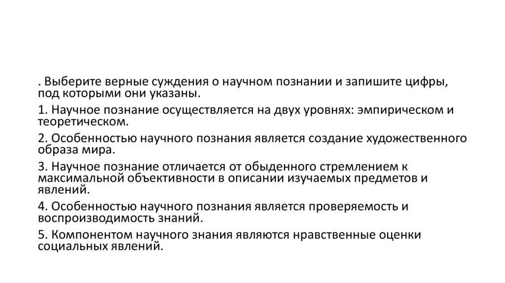 . Выберите верные суждения о научном познании и запишите цифры,под которыми они указаны.