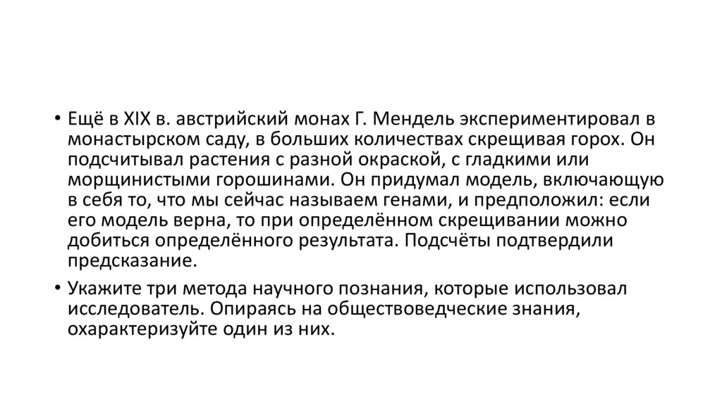 • Ещё в XIX в. австрийский монах Г. Мендель экспериментировал вмонастырском саду, в больших количествах скрещивая горох. Он