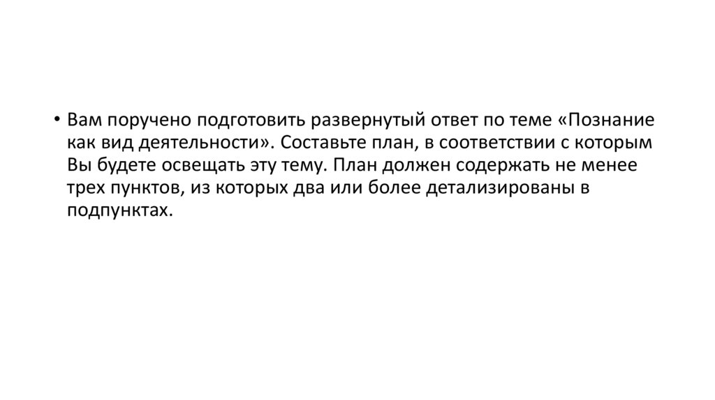 • Вам поручено подготовить развернутый ответ по теме «Познаниекак вид деятельности». Составьте план, в соответствии с которым