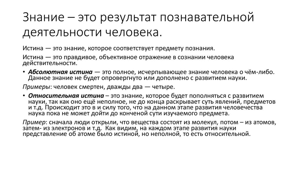 • Относительная истина – это знание, которое будет пополняться с развитием