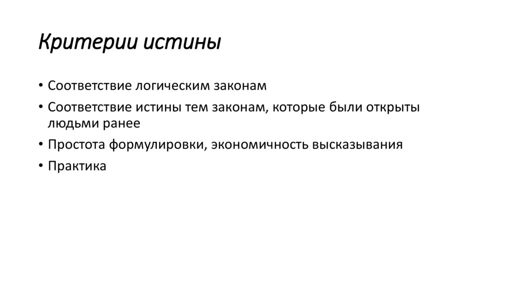 Критерии истины• Соответствие логическим законам