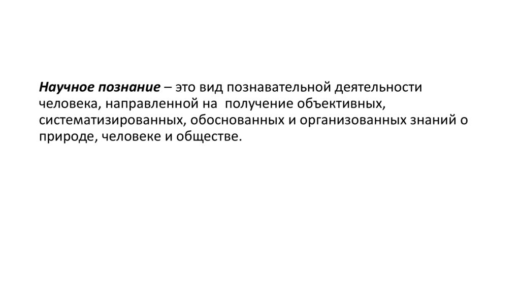 Научное познание – это вид познавательной деятельностичеловека, направленной на получение объективных,