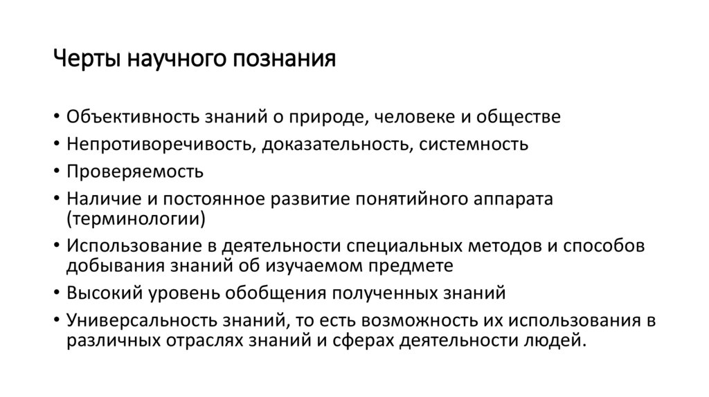 Черты научного познания• Объективность знаний о природе, человеке и обществе