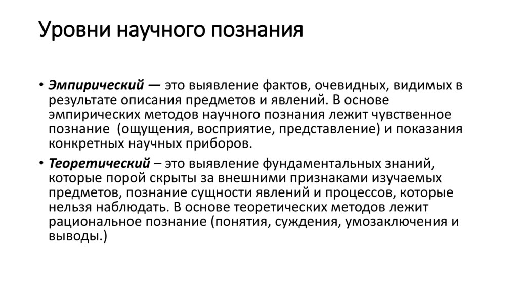 Уровни научного познания• Эмпирический — это выявление фактов, очевидных, видимых в