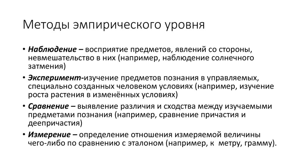 Методы эмпирического уровня• Наблюдение – восприятие предметов, явлений со стороны,