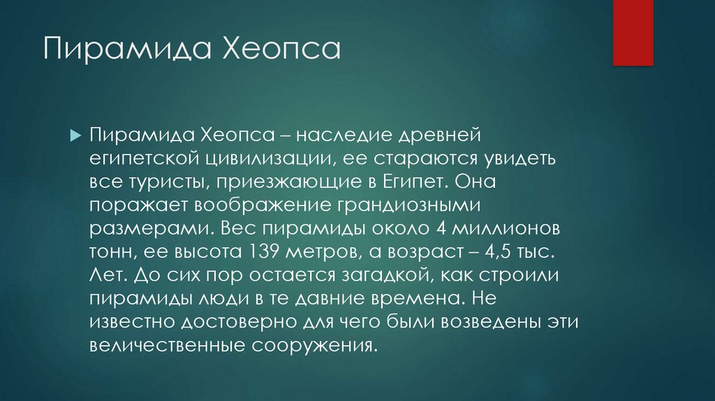 Пирамида ХеопсаПирамида Хеопса – наследие древней
