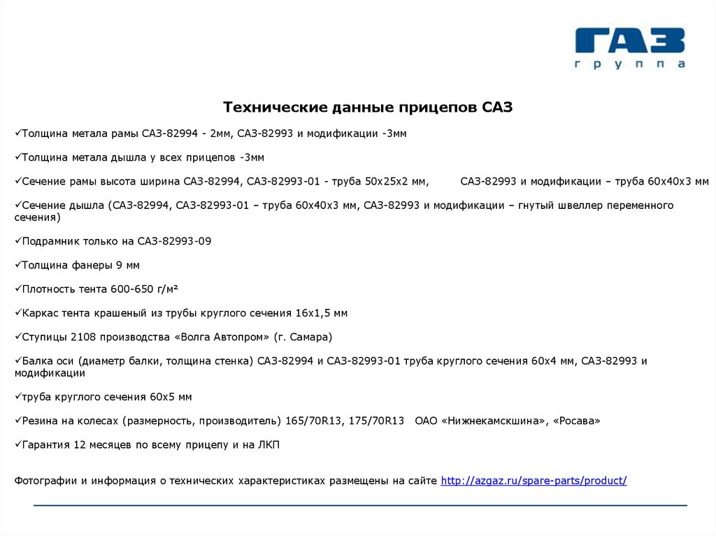 Технические данные прицепов САЗТолщина метала рамы САЗ-82994 - 2мм, САЗ-82993 и модификации -3мм