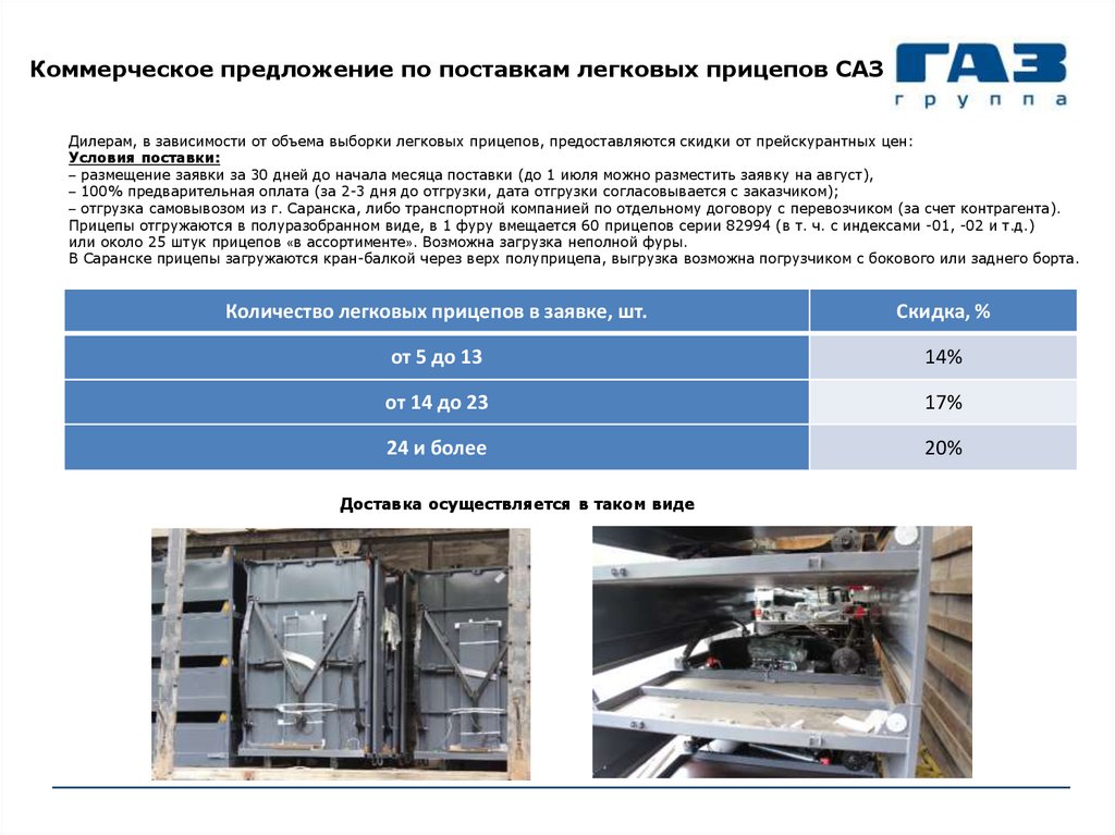 Коммерческое предложение по поставкам легковых прицепов САЗДилерам, в зависимости от объема выборки легковых прицепов, предоставляются скидки от прейскурантных цен: