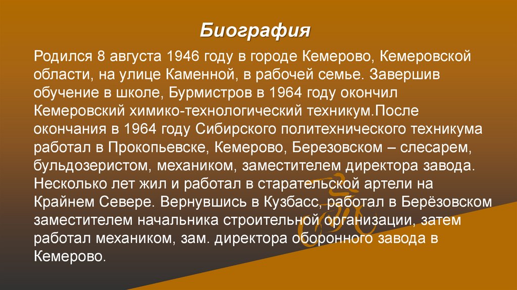 БиографияРодился 8 августа 1946 году в городе Кемерово, Кемеровской