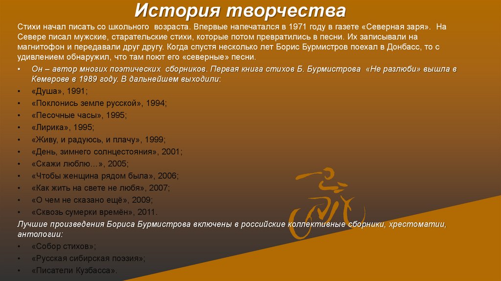 • Он – автор многих поэтических сборников. Первая книга стихов Б. Бурмистрова «Не разлюби» вышла в