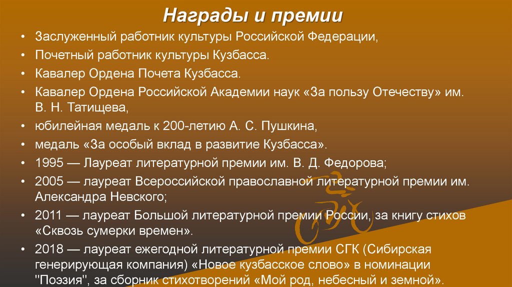 2018 — лауреат ежегодной литературной премии СГК (Сибирская