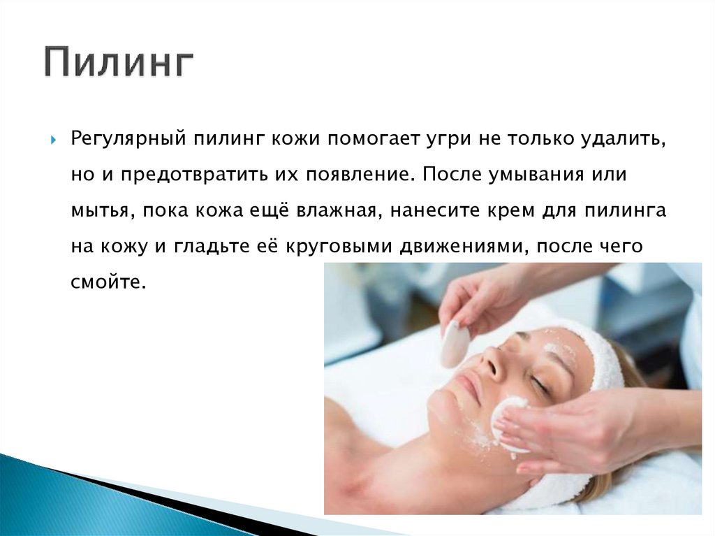 Регулярный пилинг кожи помогает угри не только удалить,но и предотвратить их появление. После умывания или