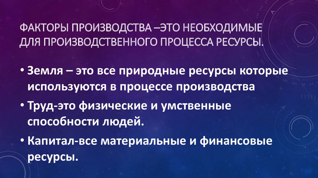 ФАКТОРЫ ПРОИЗВОДСТВА –ЭТО НЕОБХОДИМЫЕДЛЯ ПРОИЗВОДСТВЕННОГО ПРОЦЕССА РЕСУРСЫ.