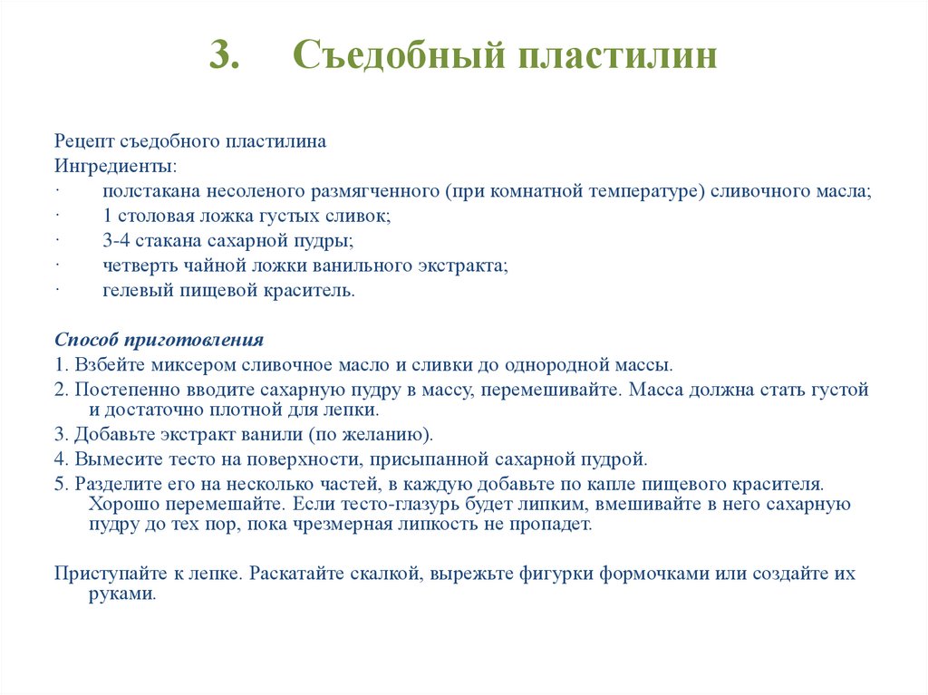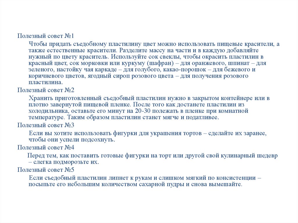Полезный совет №1Чтобы придать съедобному пластилину цвет можно использовать пищевые красители, а