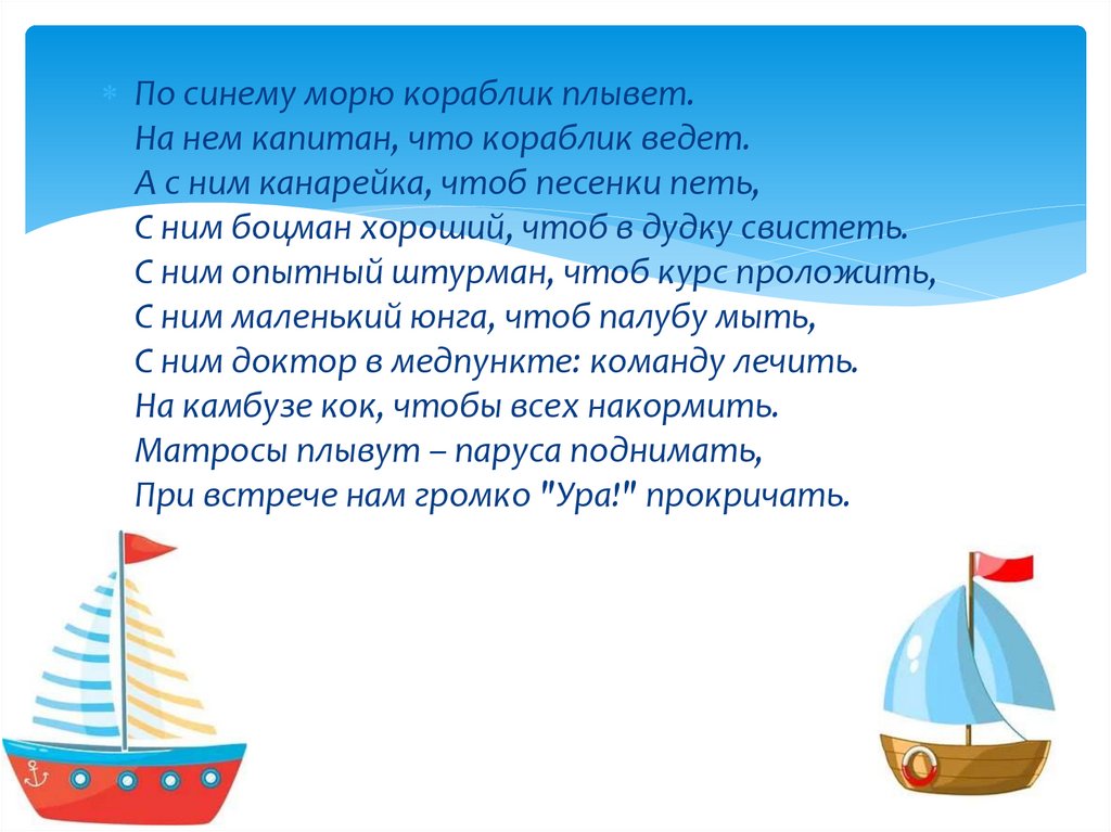 По синему морю кораблик плывет.На нем капитан, что кораблик ведет.