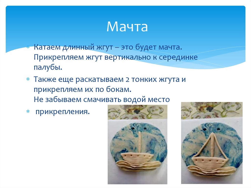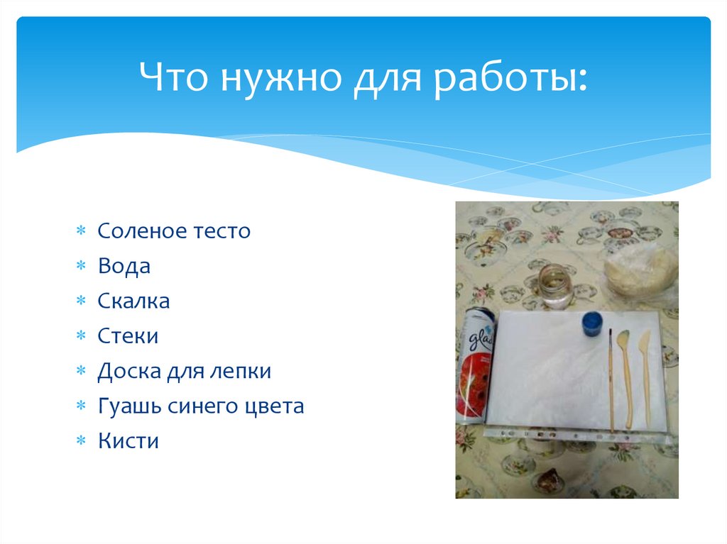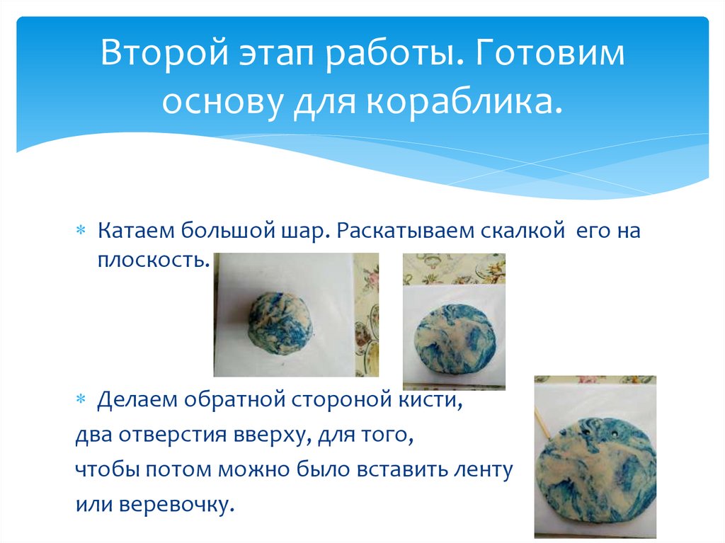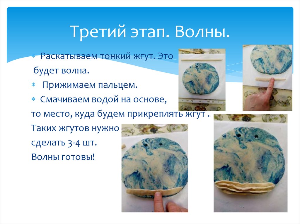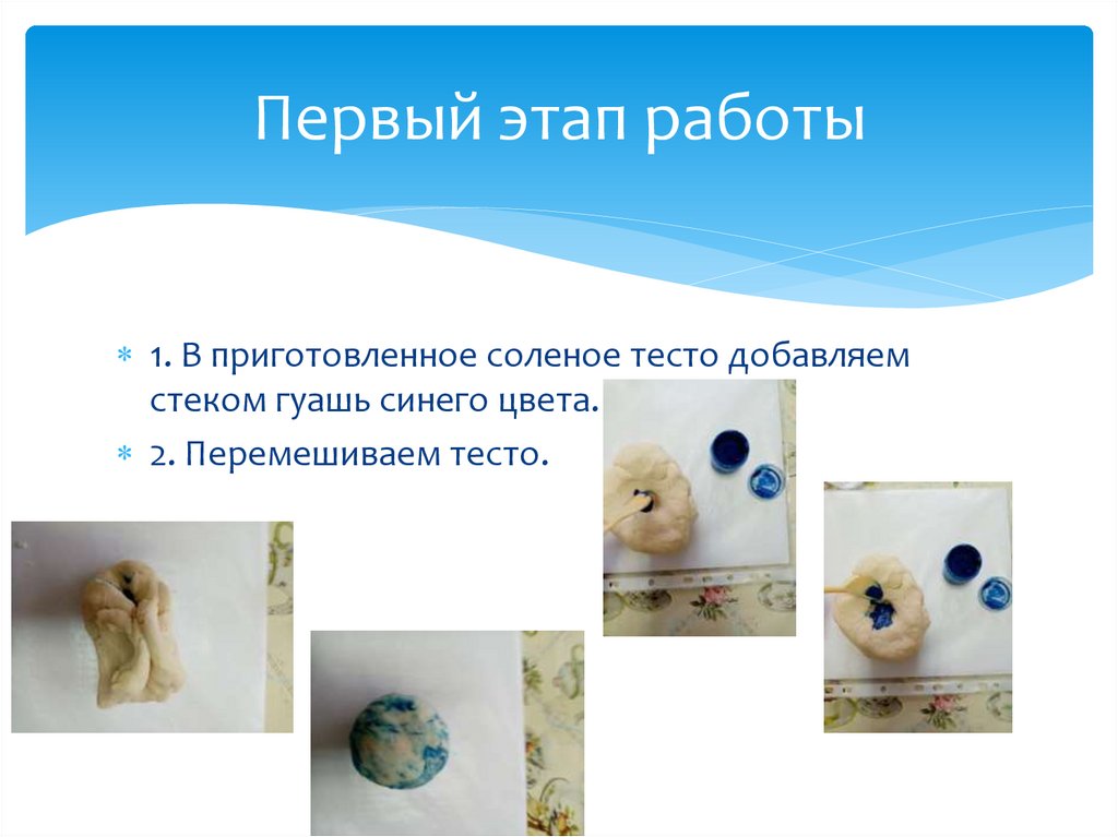 Первый этап работы1. В приготовленное соленое тесто добавляем