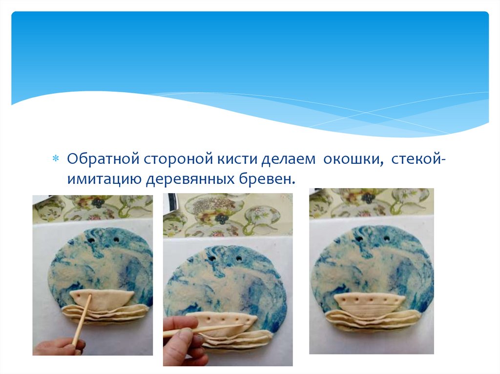 Обратной стороной кисти делаем окошки, стекойимитацию деревянных бревен.9.