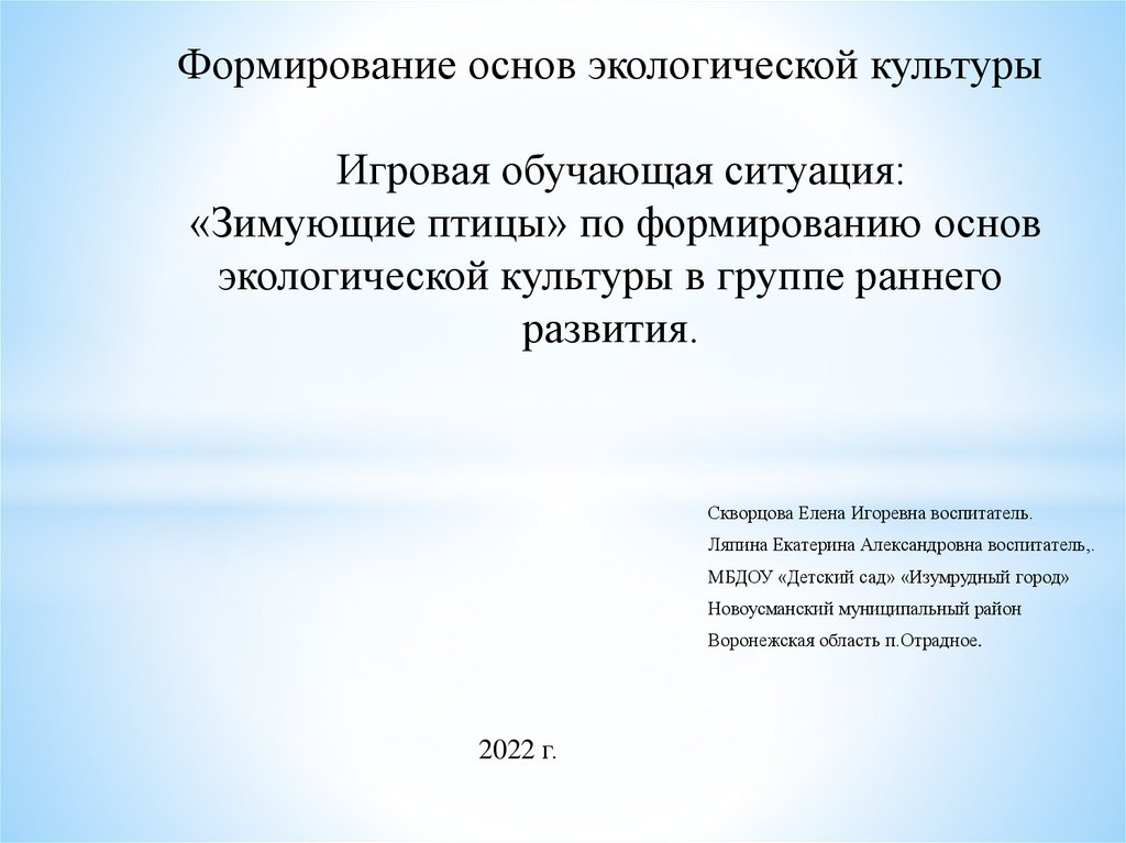 Формирование основ экологической культурыИгровая обучающая ситуация: