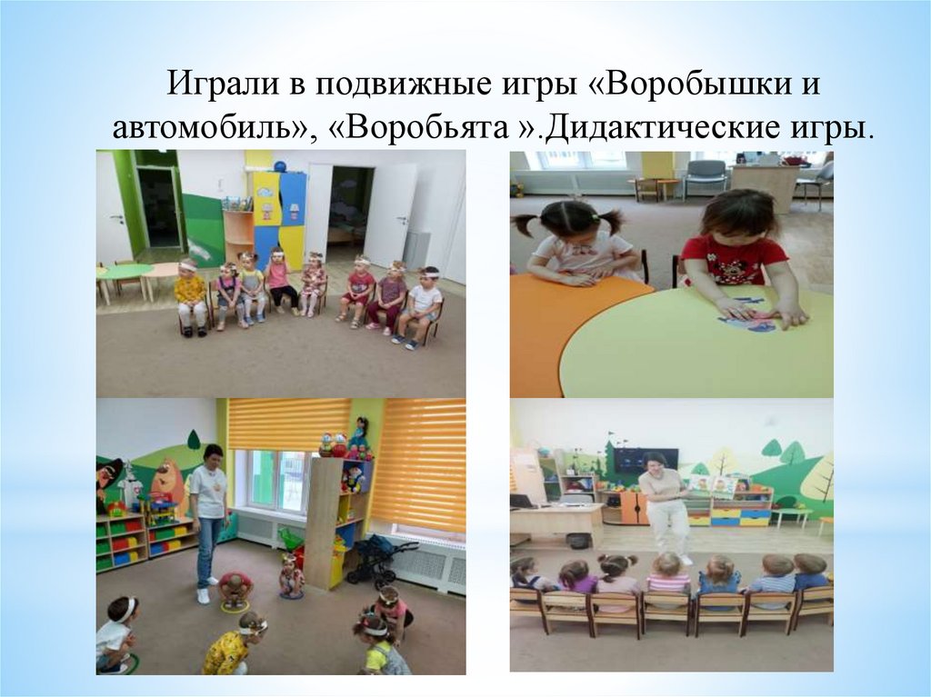 Играли в подвижные игры «Воробышки иавтомобиль», «Воробьята ».Дидактические игры.