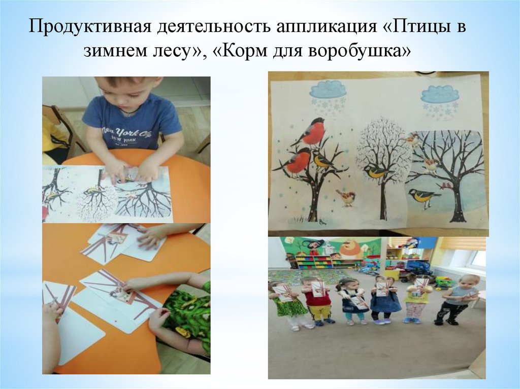 Продуктивная деятельность аппликация «Птицы взимнем лесу», «Корм для воробушка»