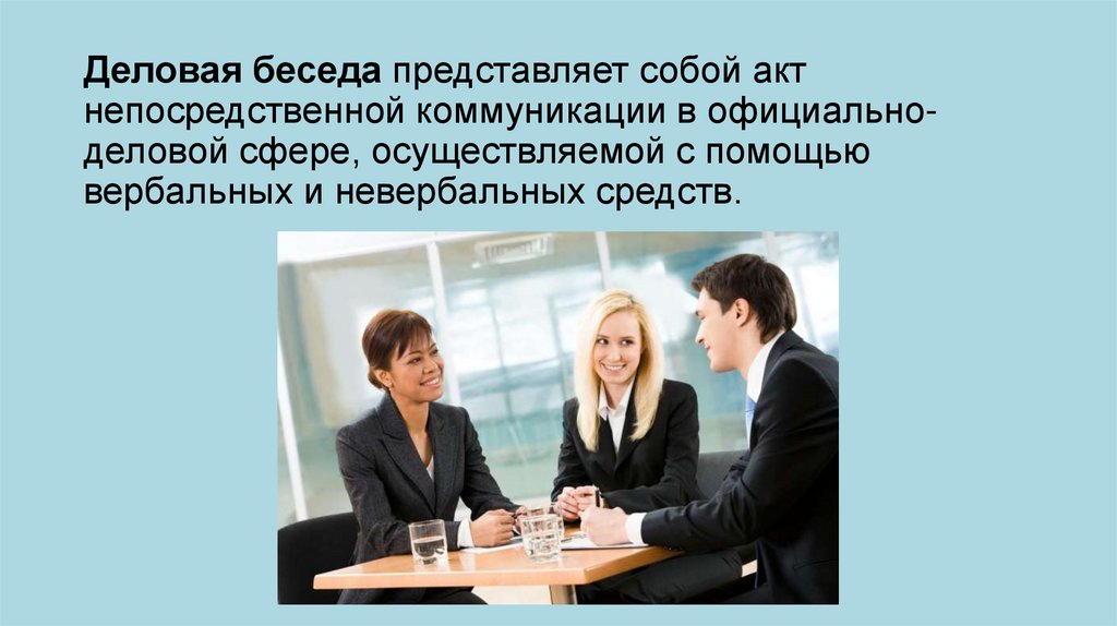 Деловая беседа представляет собой актнепосредственной коммуникации в официальноделовой сфере, осуществляемой с помощью