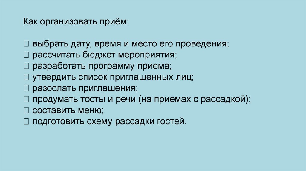 Как организовать приём: выбрать дату, время и место его проведения;